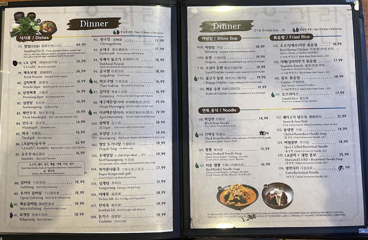 The menu at Han Il Kwan features a variety of traditional Korean dishes, with options organized into several key categories to accommodate different dining preferences. Visitors can choose from a selection of bibimbap varieties including classic, stone pot, and versions with seafood, squid, or bulgogi. Fried rice options range from beef and shrimp to vegetable kimchi and combo fried rice, as well as omelette rice.
